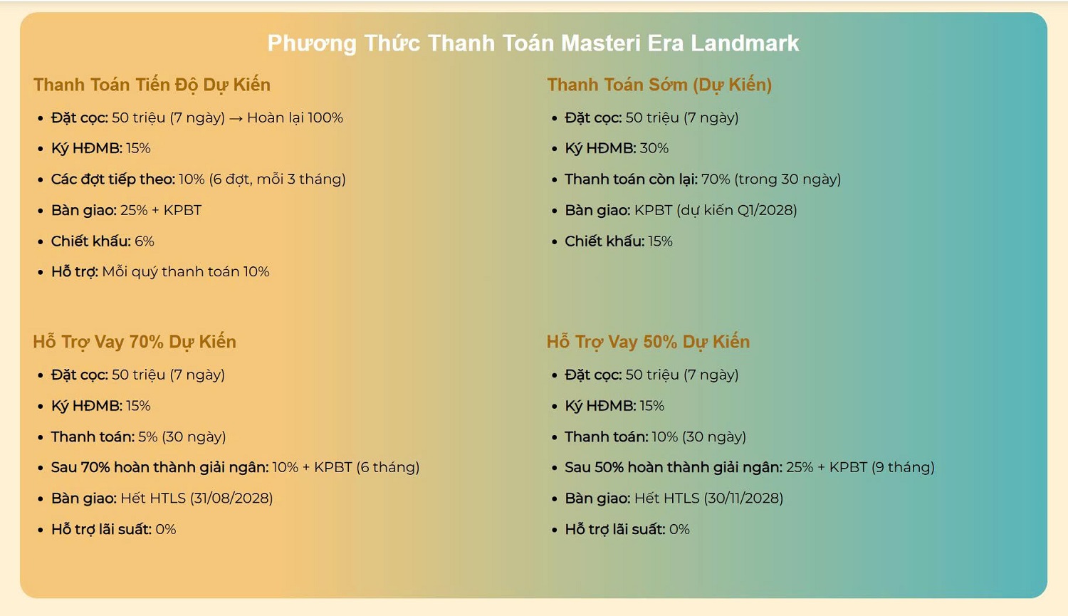Theo tài liệu tham khảo: Đặt cọc 50 triệu đồng; đợt 1 ký HĐMB trong 7 ngày; sau đó thanh toán theo tiến độ nhiều đợt cho tới khi bàn giao Quý 1/2028.