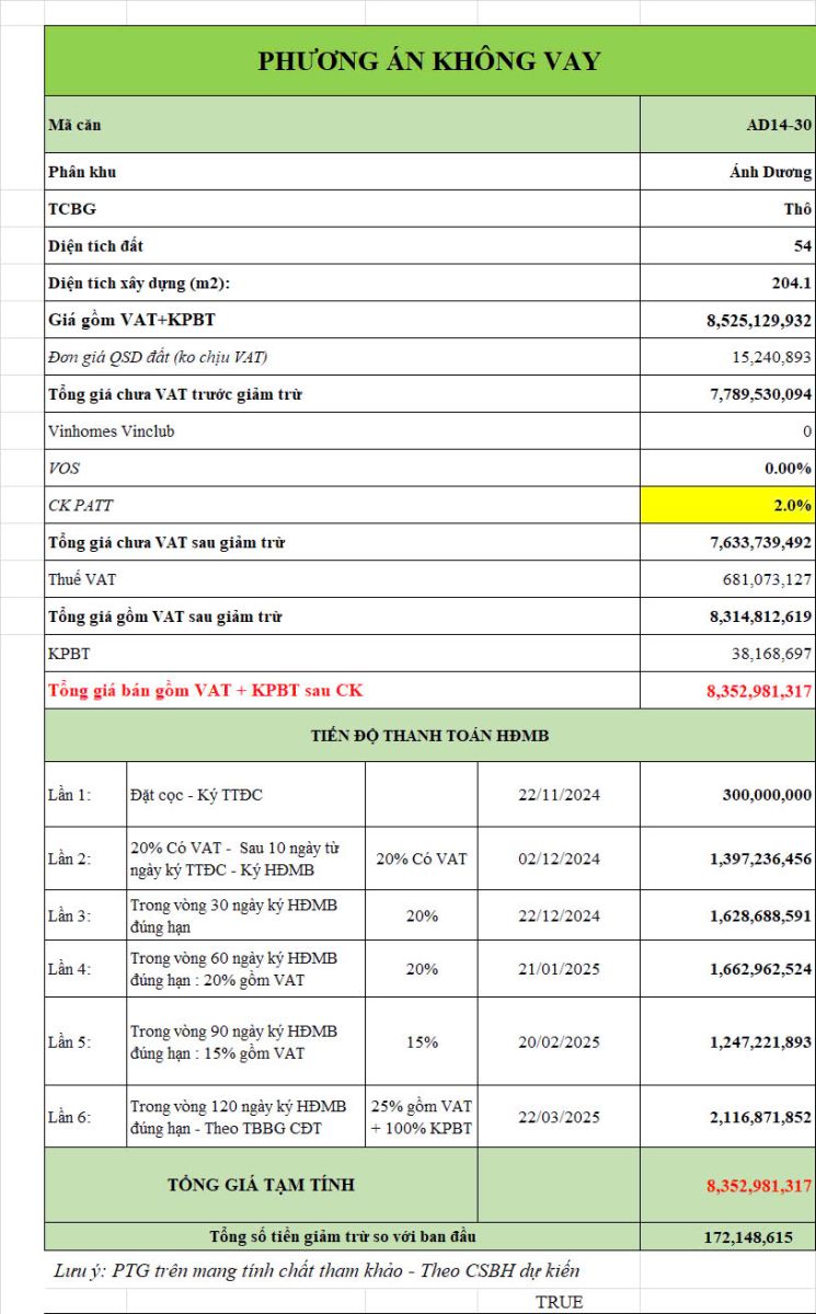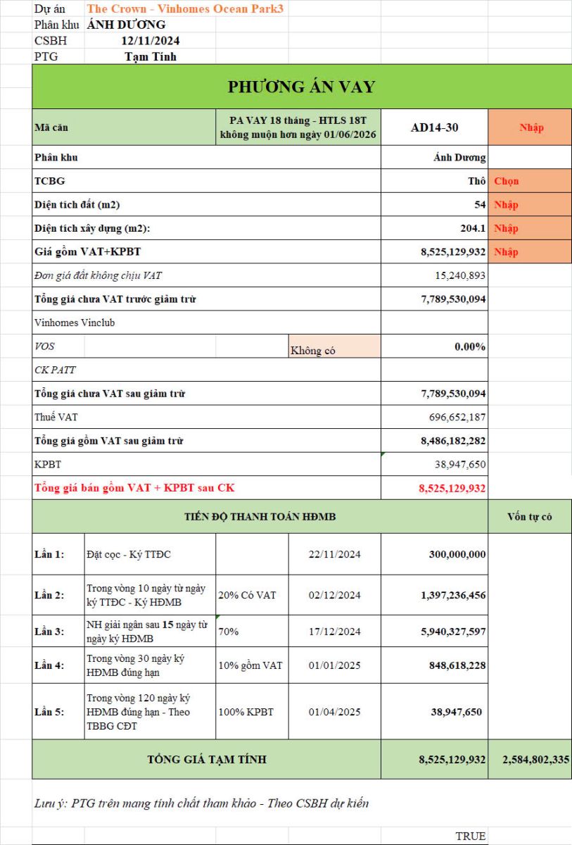 Phiếu Tính Giá Chi Tiết Của AD1430 Vinhomes Ocean Park 3